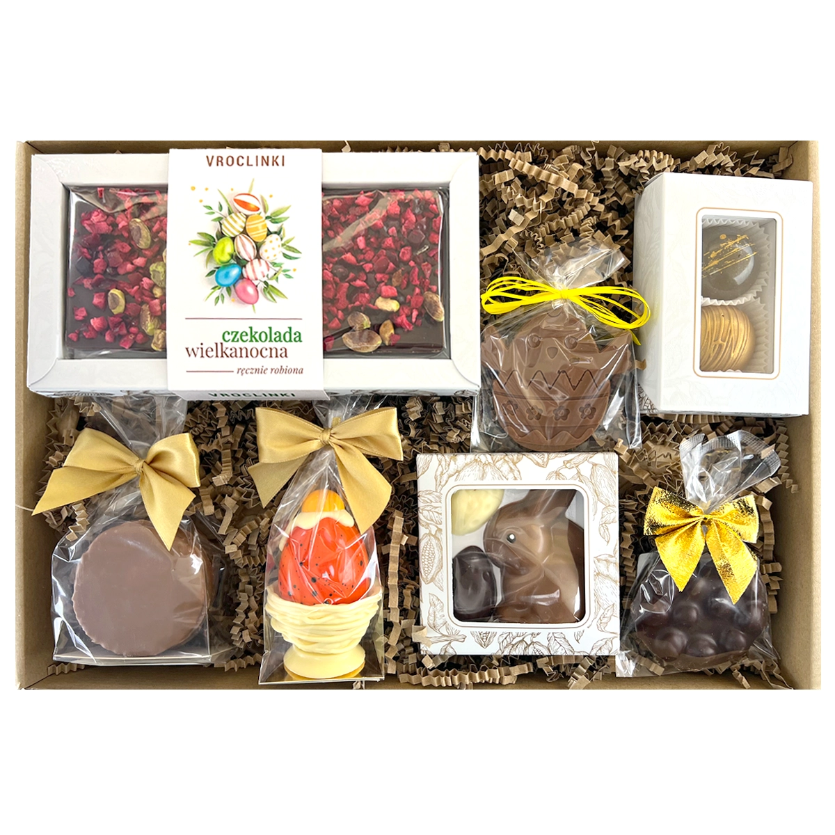 Wielkanocny Zając z pisankami z mlecznej, białej i deserowej czekolady